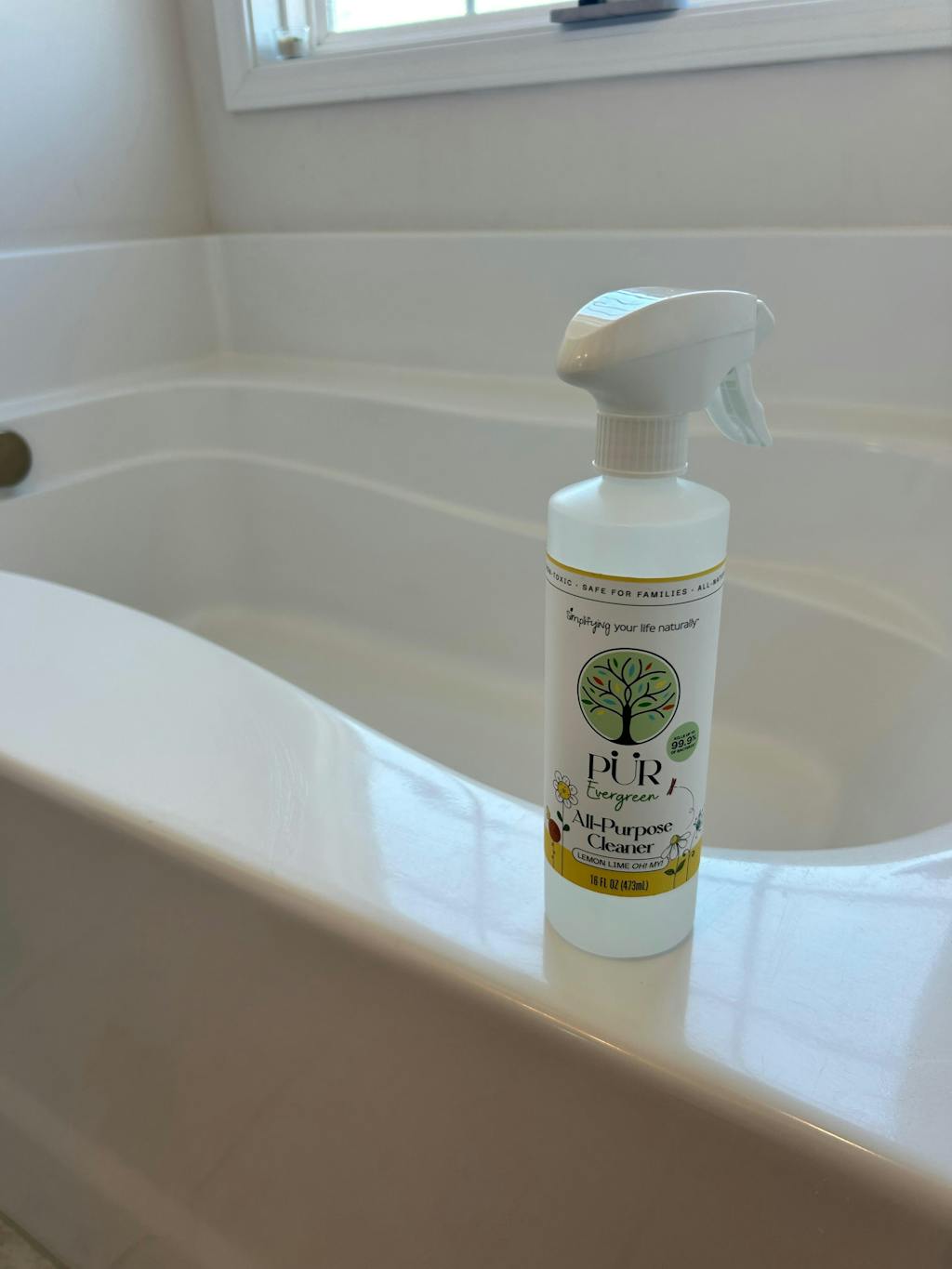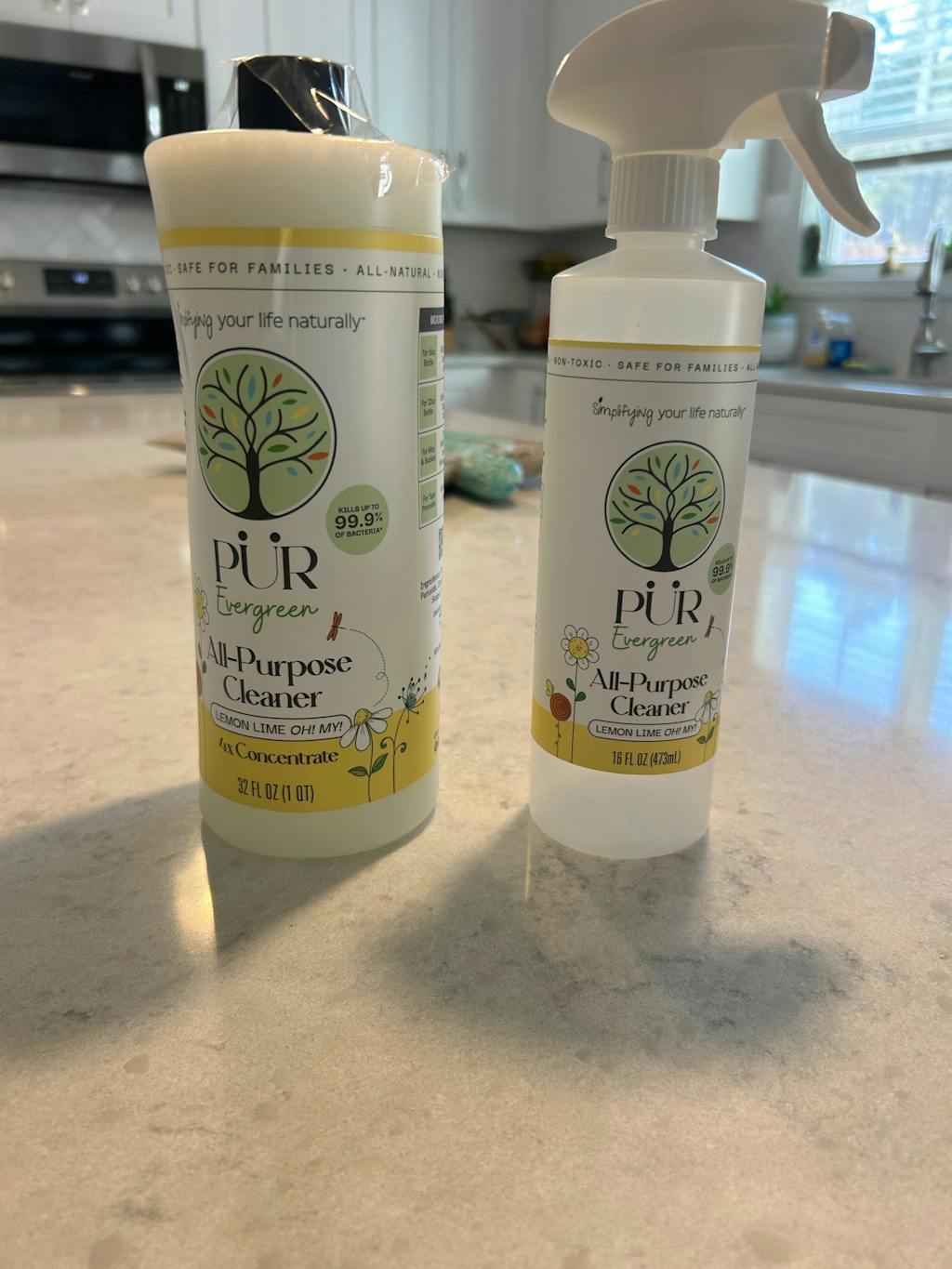 Two bottles of PUR Evergreen All-Purpose Cleaner on a gray background